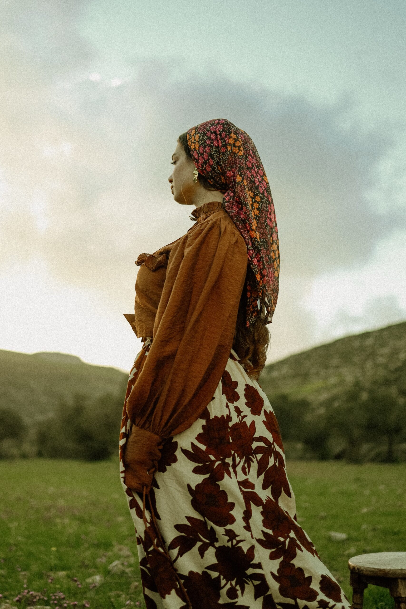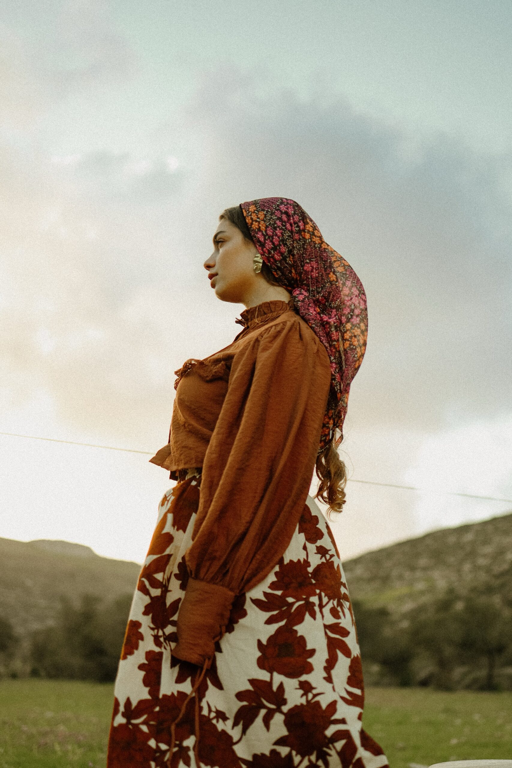 בנדנה פרחונית עם פסי זהב שזורים וסרט החלקה מובנה.