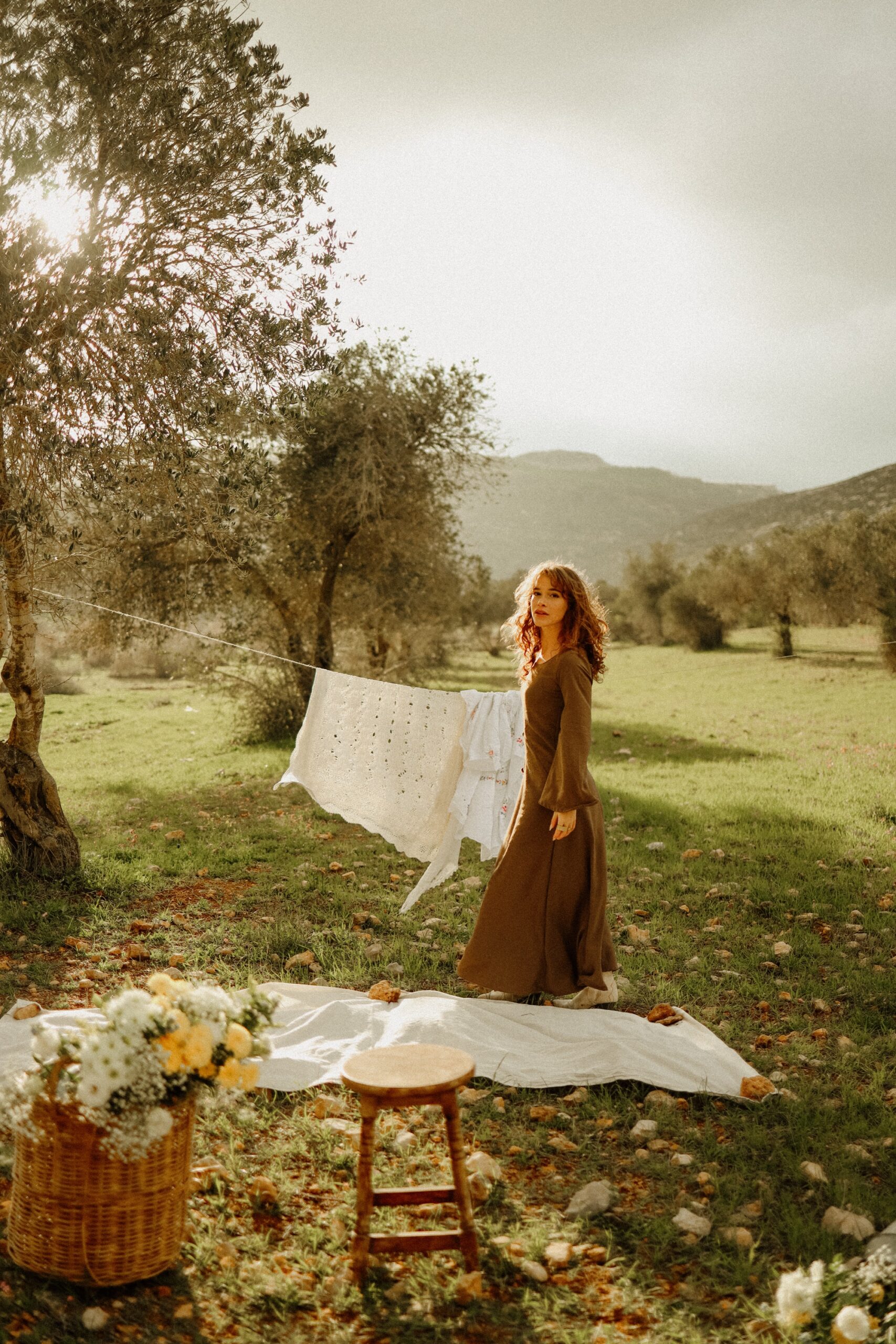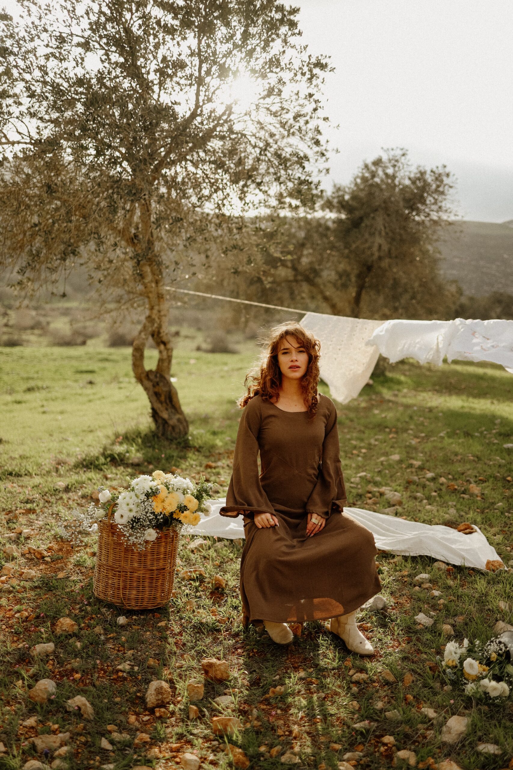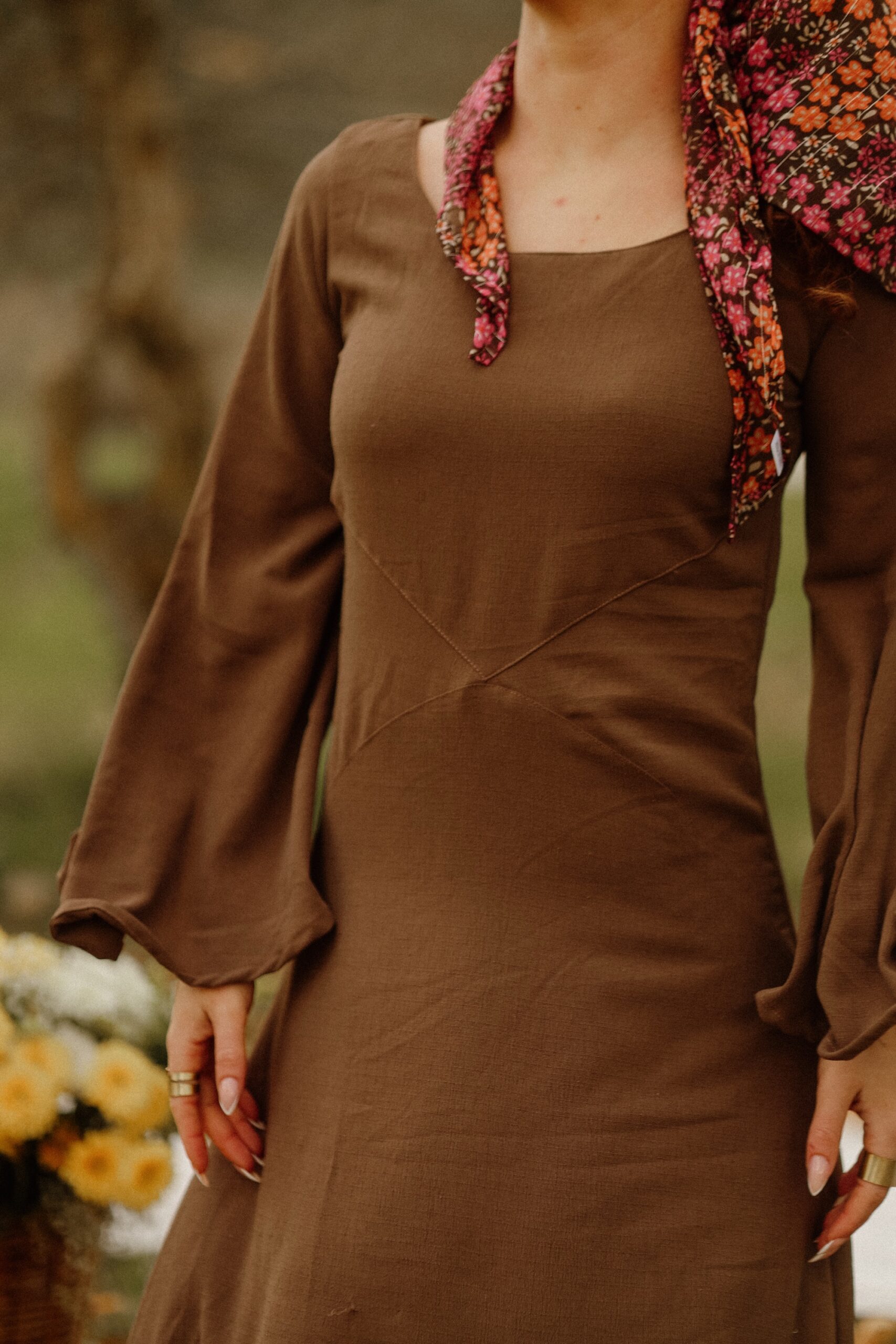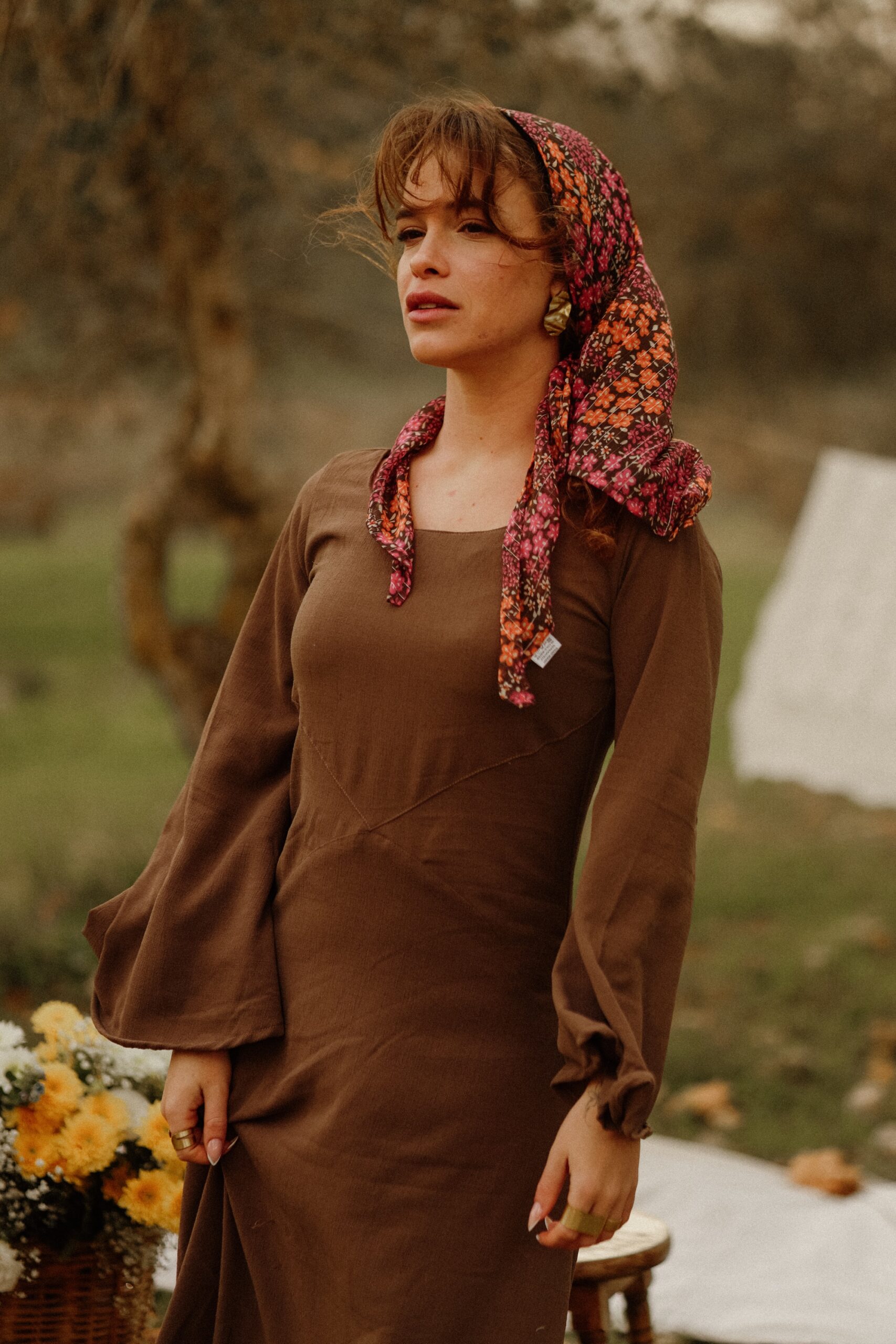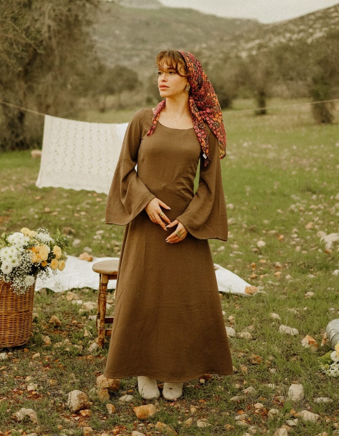 שמלה מבד נשפך עם איקסים מחמיאים במותן, שרוולים נפתחים, בד נעים וקליל.